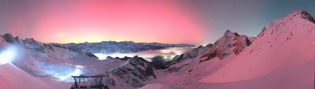 A rare and extraordinary moment: the northern lights dancing above the Italian Alps. Soft shades of pink and violet illuminate the snow-covered peaks, blending cosmic energy with alpine silence. A reminder that even the most remote wonders can sometimes find their way south.